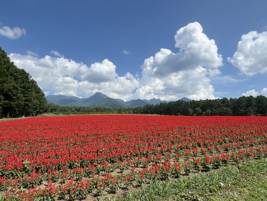当館から車で10分ほど行った所に、今年から始まった八ヶ岳農業大学校のお花畑プロジェクトの農地があります。一面に広がる真っ赤なサルビアの花が、夏空にコントラスト良く映えています。